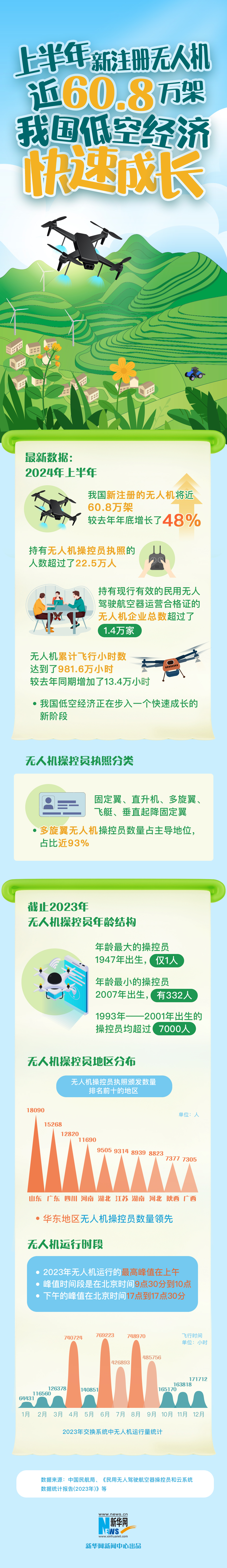 上半年新注册无人机近60.8万架 我国低空经济快速成长-2024年上半年我国新注册的无人机将近60.8万架,较去年年底增长了48%。…